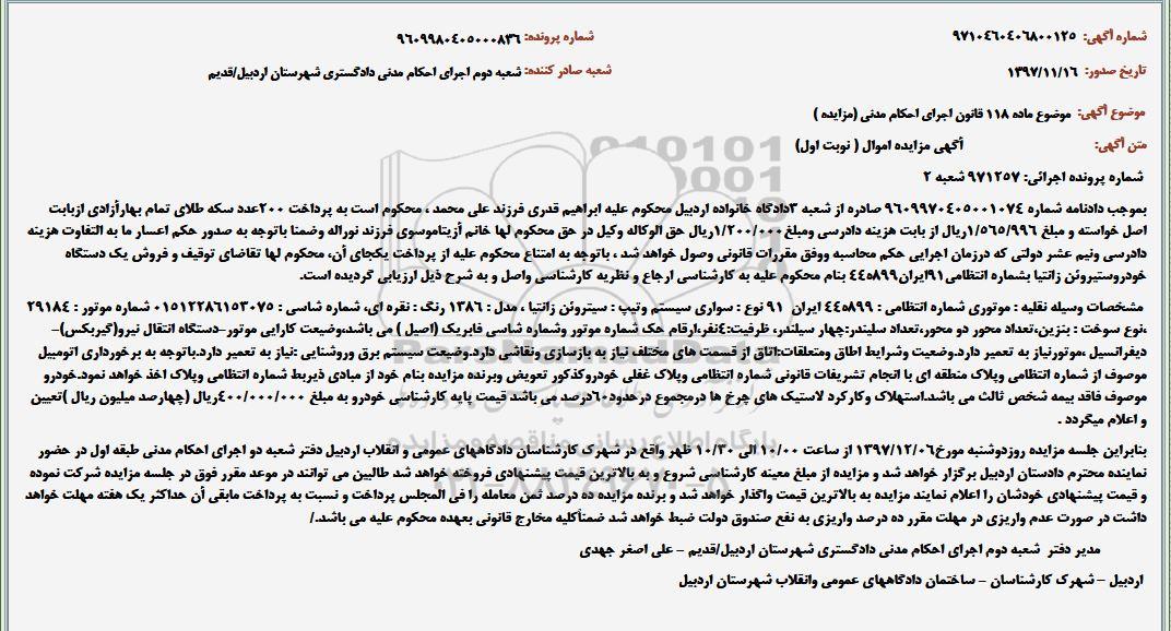 سواری سیتروئن زانتیا مدل 1386 رنگ نقره ای به مبلغ 400.000.000 ریال مزایده در روز دوشنبه مورخ 97.12.6 ساعت 10 الی 10.30 ظهر واقع در شهرک کارشناسان دادگاههای عمومی انقلاب اردبیل دفتر شعبه دو اجرای احکام مدنی طبقه اول