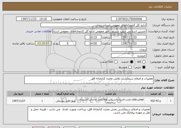شرح کلی نیاز: تعمیرات و اصلاح سیمکشی بخش مخزن کتابخانه افق