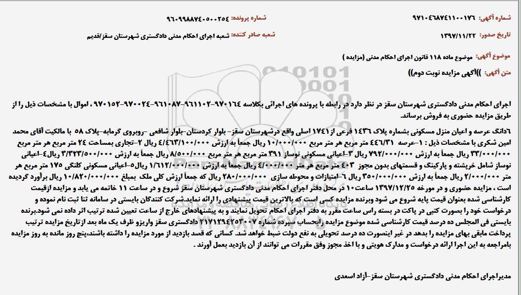 مزایده ششدانگ عرصه و اعیان منزل مسکونی نوبت دوم کلاسه 970164