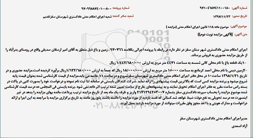 مزایده یک قطعه باغ مساحت 4471 مترمربع نوبت دوم , مزایده مزایده یک قطعه باغ مساحت 4471 مترمربع نوبت دوم
