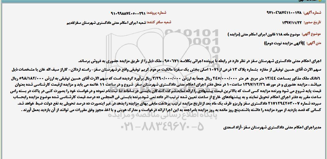 مزایده ششدانگ ملک مساحت 13.44 مترمربع نوبت دوم کلاسه 950671