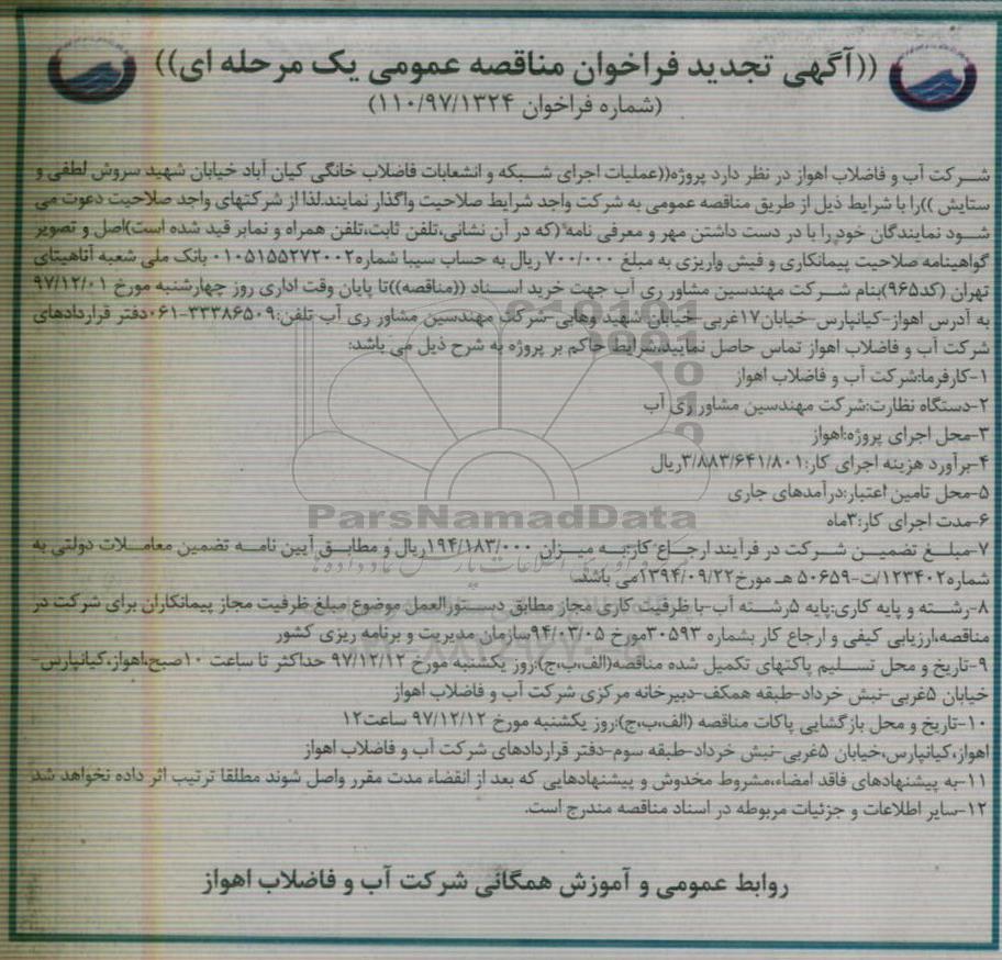 شرکت آب و فاضلاب اهواز در نظر دارد پروژه « عملیات اجرای شبکه و انشعابات فاضلاب خانگی کیان آباد خیابان شهید سروش لطفی و ستاش را با شرایط ذیل از طریق مناقصه عمومی به شرکت واجد صلاحیت واگذار نماید. لذا از شرکت های واجد صلاحیت دعوت می شود، نمایندگان خود را با در دست داشتن مهر شرکت و معرفی نامه (که در آن نشانی، تلفن ثابت، تلفن همراه و نمابر قید است)، اصل و تصویر گواهینامه صلاحیت پیمانکاری و فیش واریز به مبلغ 700.000 ریال به حساب جام شماره 0105155272002 بانک ملی شعبه آنهایتای تهران کد 965 به نام شرکت مهندسین مشاور ری آب جهت خرید اسناد «مناقصه» تا پایان وقت اداری روز چهارشنبه مورخ 97.12.01 به آدرس: اهواز، کیانپارس، خیابان 17 غربی- خیابان شهید وهابی، شرکت مهندسین مشاور ری اب تلفن شماره تلفن 33386509-061 دفتر قراردادهای شرکت آب و فاضلاب اهواز تماس حاصل نمایید شرایط حاکم بر پروژه به شرح ذیل می باشد