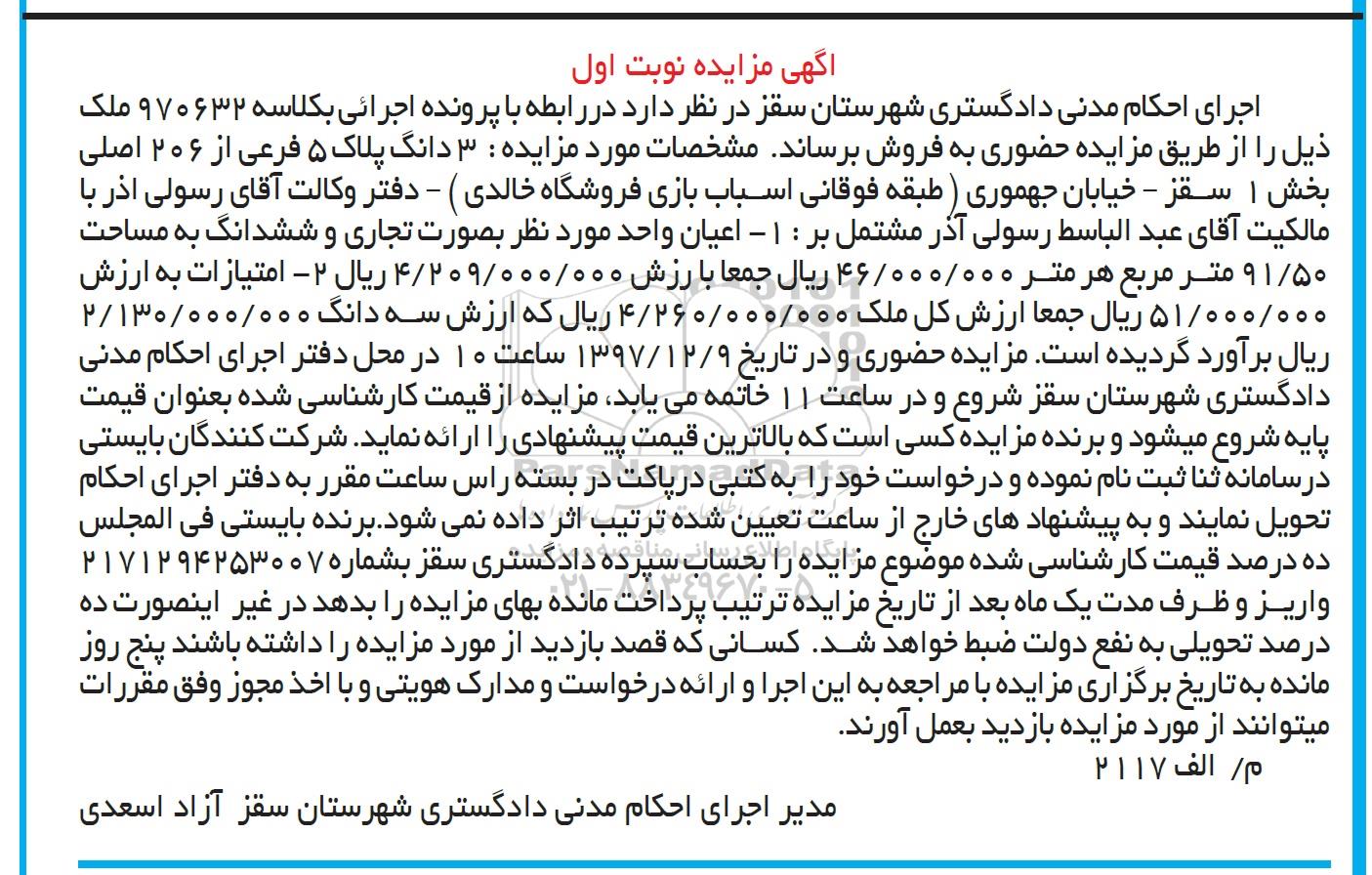 مزایده 3 دانگ پلاک 5 فرعی از 206 اصلی کلاسه 970632 نوبت اول