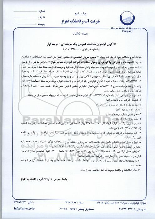 شركت آب و فاضلاب اهواز در نظر دارد پروژه تامین نیروی انتظامی به منظور افزایش ضریب حفاظتی و تامین امنیت تاسیسات و همراهی با گروههای وصول مطالبات شرکت آب و فاضلاب اهواز را با شرايط ذيل را از طريق مناقصه عمومی به شركت و یا موسسات واجد صلاحيت واگذار نمايد. لذا از شركتها و موسسات واجد صلاحيت دعوت مي شود ،نمایندگان خود را با در دست داشتن مهر شرکت و معرفی نامه(که در آن نشانی،تلفن ثابت، تلفن همراه و نمابر قید شده است به همراه اصل وکپی مجوز اداره انتظام نیروی انتظامی جمهوری اسلامی ایران و فيش واريز وجه به مبلغ 100.000 ريال به حساب جاری شماره ۰۱۰۲۹۵۲۷۲۲۰۰۱ بانک صادرات شعبه فلکه اول کیانپارس بنام شرکت آب و فاضلاب اهواز ، جهت خريد اسناد ‹‹مناقصه ›› تا پایان وقت اداری روز چهارشنبه مورخ 97.12.01 به آدرس: اهواز-کیانپارس خیابان 5 غربی-نبش خرداد –طبقه سوم- دفتر قراردادهای شرکت آب و فاضلاب اهواز معرفی نمایند.