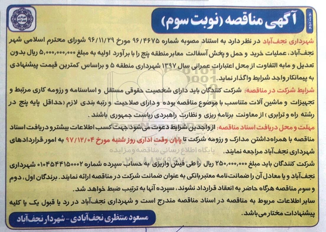 شهرداری نجف آباد در نظر دارد به استناد مصوبه شماره 4675/ 96 مورخ 96.11.29 شورای محترم اسلامی شهر نجف آباد، عملیات خرید و حمل و پخش آسفالت معابر منطقه پنج را با برآورد اولیه به مبلغ 5.000.000.000 ریال بدون تعدیل و مابه التفاوت از محل اعتبارات عمرانی سال 1397 شهرداری منطقه 5 و براساس کمترین قیمت پیشنهادی به پیمانکار واجد شرایط واگذار نماید