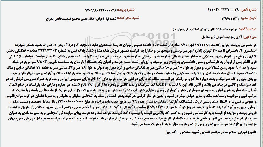 مزایده فروش ملک مشاع 96.03 مترمربع کلاسه 972491 .اجرا.97
