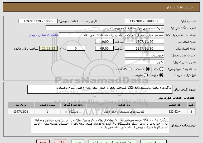 شرح کلی نیاز: بارگیری و تخلیه ترانسفورماتور 132 کیلوولت بهمراه صدور بیمه نامه و طبق شرح توضیحات