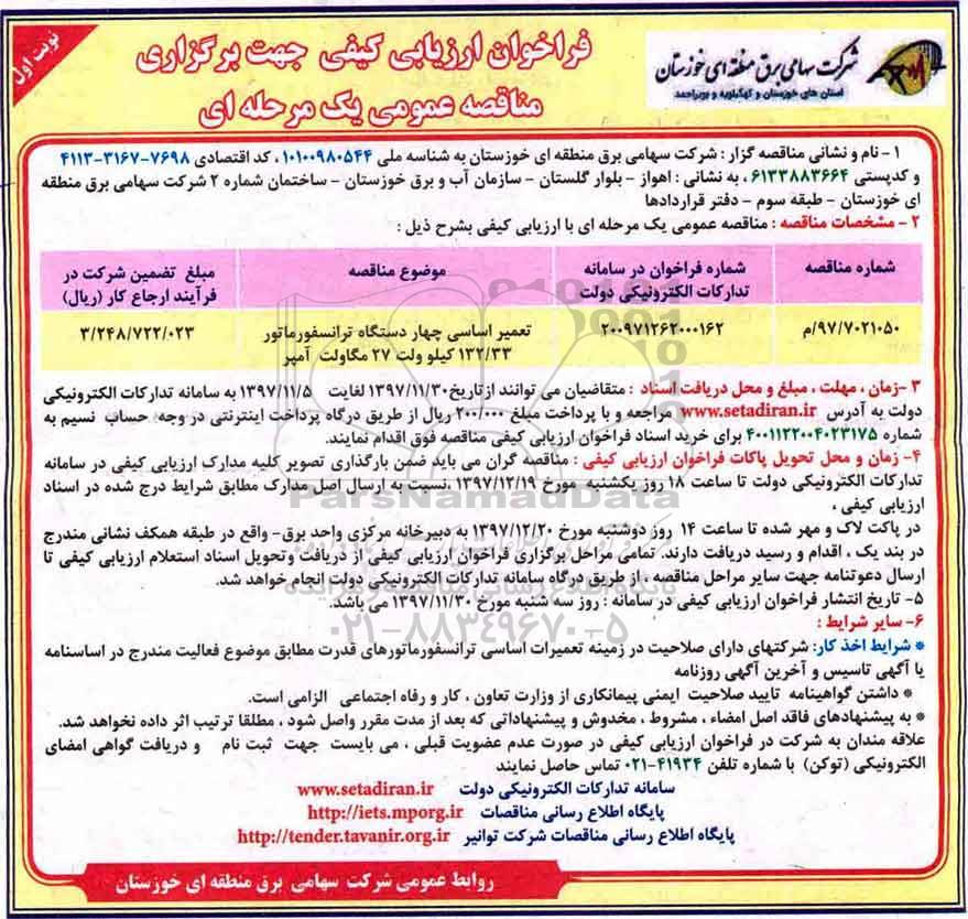 فراخوان تعمیر اساسی چهار دستگاه ترانسفورماتور از کلیه افراد متخصص و شرکتها واجد شرایط دعوت به عمل میآید در مناقصه با کد خبرگزاری پارس نماد: 1519904 شرکت نمایند.