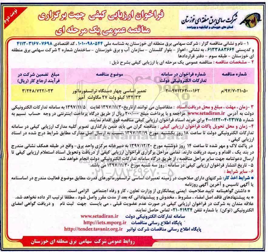 فراخوان تعمیر اساسی چهار دستگاه ترانسفورماتور - نوبت دوم از کلیه افراد متخصص و شرکتها واجد شرایط دعوت به عمل میآید در مناقصه با کد خبرگزاری پارس نماد: 1522458 شرکت نمایند.