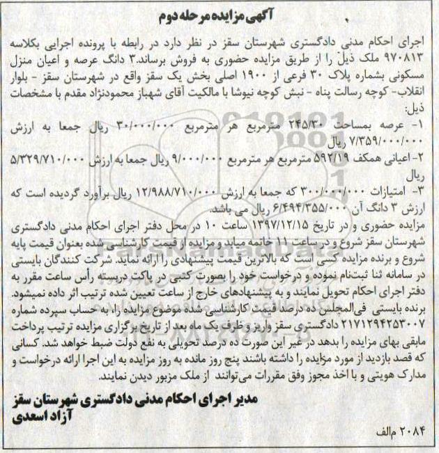 مزایده فروش 3 دانگ عرصه و اعیان منزل مسکونی مرحله دوم کلاسه 970813