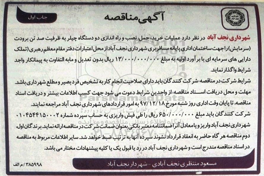 شهرداری نجف آباد در نظر دارد عملیات خرید، حمل، نصب و راه اندازی دو دستگاه چیلر به ظرفیت صد تن برودت سرمایش را جهت ساختمان اداری پایانه مسافربری شهرداری نجف آباد از محل اعتبارات دفتر مقام معظم رهبری تملک دارایی های سرمایه ای با برآورد اولیه به مبلغ 13.000.000.000 ریال بدون تعدیل و مابه التفاوت به پیمانکار واجد شرایط واگذار نماید. شرایط شرکت در مناقصه شرکت کنندگان باید دارای صلاحیت انجام کار به تشخیص فرد بصیر و مطلع شهرداری باشد. مهلت و محل دریافت اسناد مناقصه از واجدین شرایط دعوت می شود جهت کسب اطلاعات بیشتر و دریافت اسناد مناقصه تا پایان وقت اداری روز شنبه مورخ 97.12.18 به امور قراردادهای شهرداری نجف اباد مراجعه نمایند.