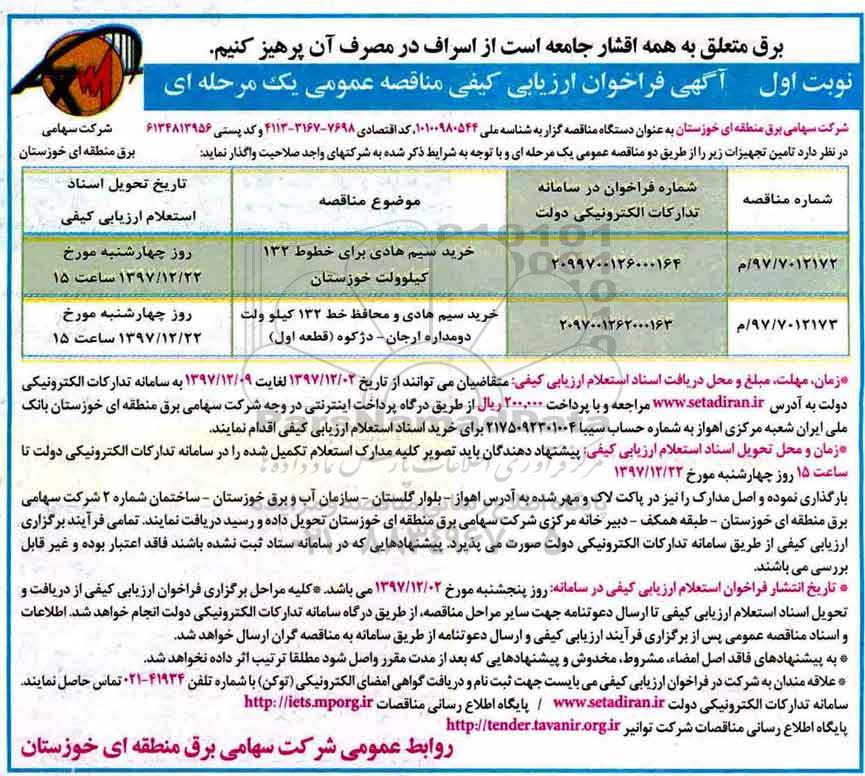 2099700126000164 | خرید سیم هادی برای خطوط 132 کیلوولت خوزستان |