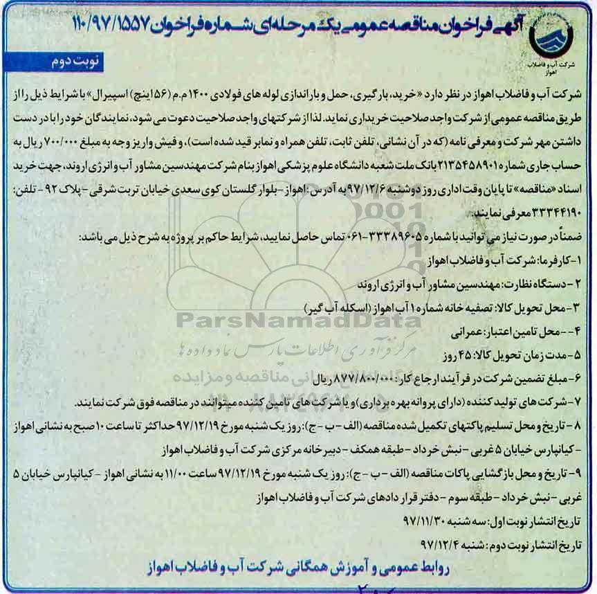 شرکت آب و فاضلاب اهواز در نظر دارد خرید، بارگیری، حمل و باراندازی لوله های فولادی 1400 م.م (56 اینچ) اسپیرال با شرایط ذیل را از طریق مناقصه عمومی از شرکت واجد صلاحیت خریداری نماید. لذا از شرکت های واجد صلاحیت دعوت می شود، نمایندگان خود را با در دست داشتن مهر شرکت و معرفی نامه (که در آن نشانی، تلفن ثابت، تلفن همراه و نمابر قید شده است)، و فیش واریز به مبلغ 700.000 ریال به حساب جاری شماره 2135458901 بانک ملت شعبه دانشگاه علوم پزشکی اهواز بنام شرکت مهندسین مشاور آب و انرژی اروند جهت خرید اسناد (مناقصه) تا پایان وقت اداری روز دوشنبه مورخ 97.12.06 به ادرس اهواز بلوار گلستان کوی سعدی خیابان تربت شرقی پلاک 92 تلفن 33342190 معرفی نمایند