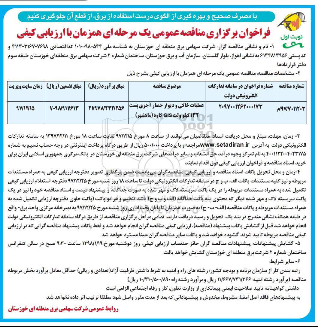 | 7011203/ 97 / م | 2097001262000173 | عملیات خاکی و دیوار حصار آجری پست 132 کیلو ولت gis کاوه ماهشهر | 21.978.232.256 | 1.098.911.613 | 97.12.15 |