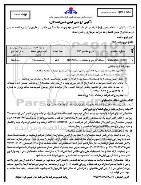 شرکت پالایش نفت امام خمینی (ره) شازند در نظر دارد کالاهای موضوع بند «یک» آگهی حاضر را از طریق برگزاری مناقصه عمومی دو مرحله ای از تامین کننده کالا واجد شرایط خریداری و تامین نماید