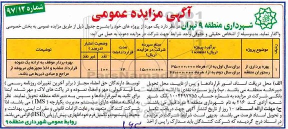 شهرداری منطقه 9 تهران در نظر دارد یک مورد به شرح جدول ذیل را از طریق مزایده عمومی به بخش خصوصی واگذار نماید. بدینوسیله از اشخاص حقیقی و حقوقی واجد شرایط جهت شرکت در مزایده دعوت بعمل می آید