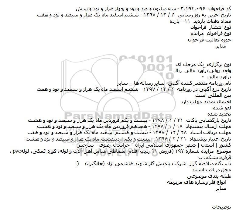 موضوع مزایده شماره ١٩٢ (فروش ١٢ ردیف اقلام اسقاطی شامل آهن آلات و لوله، کوره کمکی، لوله pvc، قرقره،بشکه، ب