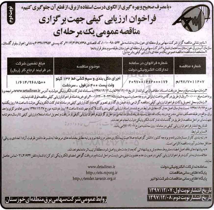فراخوان اجرای دکل بندی و سیم کشی ... نوبت دوم, مناقصه فراخوان اجرای دکل بندی و سیم کشی ... نوبت دوم