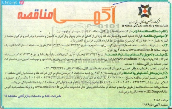 1. نام دستگاه مناقصه گزار: شرکت غله و خدمات بازرگانی منطقه 11 (استان سیستان و بلوچستان)