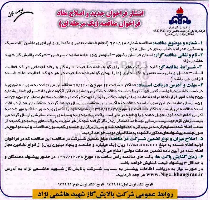 1- شماره و موضوع مناقصه: مناقصه 970818 (انجام خدمات تعمیر و نگهداری و اپراتوری ماشین آلات سبک و سنگین همراه با طناب بندی در سال 98)