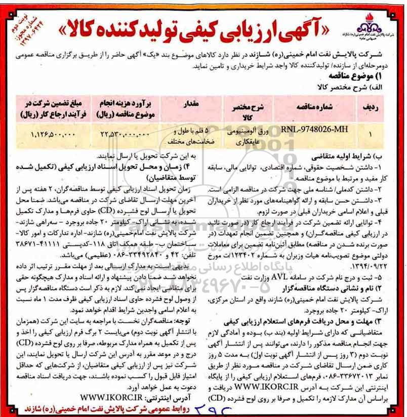 ارزیابی کیفی ورق آلومینیومی عایقکاری ... نوبت دوم از کلیه افراد متخصص و شرکتها واجد شرایط دعوت به عمل میآید در مناقصه با کد خبرگزاری پارس نماد: 1538778 شرکت نمایند.