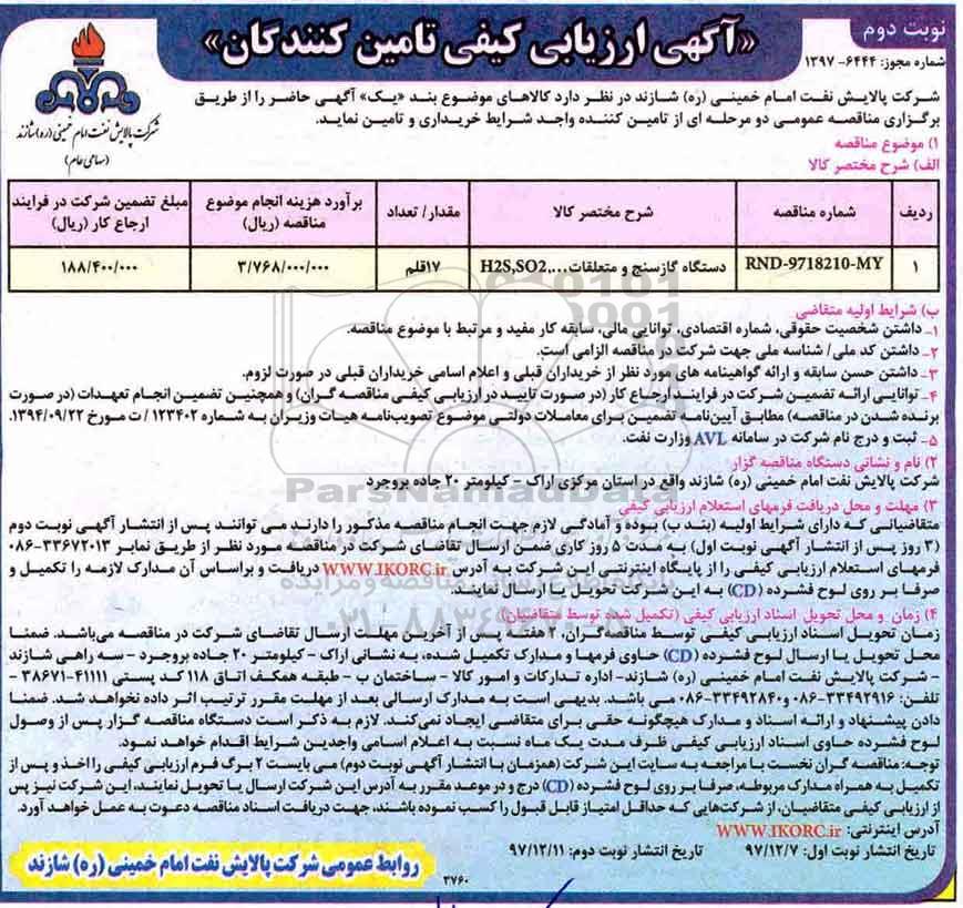 توجه: مناقصه گران نخست با مراجعه به سایت این شرکت (همزمان با انتشار آگهی نوبت دوم) می بایست ۲ برگ فرم ارزیابی کیفی را اخذ و پس از تکمیل به همراه مدارک مربوطه، صرفا بر روی لوح فشرده (CD) درج و در موعد مقرر به آدرس این شرکت ارسال با تحویل نمایند این شرکت نیز پس از ارزیابی کیفی متقاقیان، از شرکتهایی که حداقل امتیاز قابل قبول را کسب نموده باشند، جهت دریافت اسناد مناقصه دعوت بعمل خواهد آورد. آدرس اینترنتی www.ikorc.ir