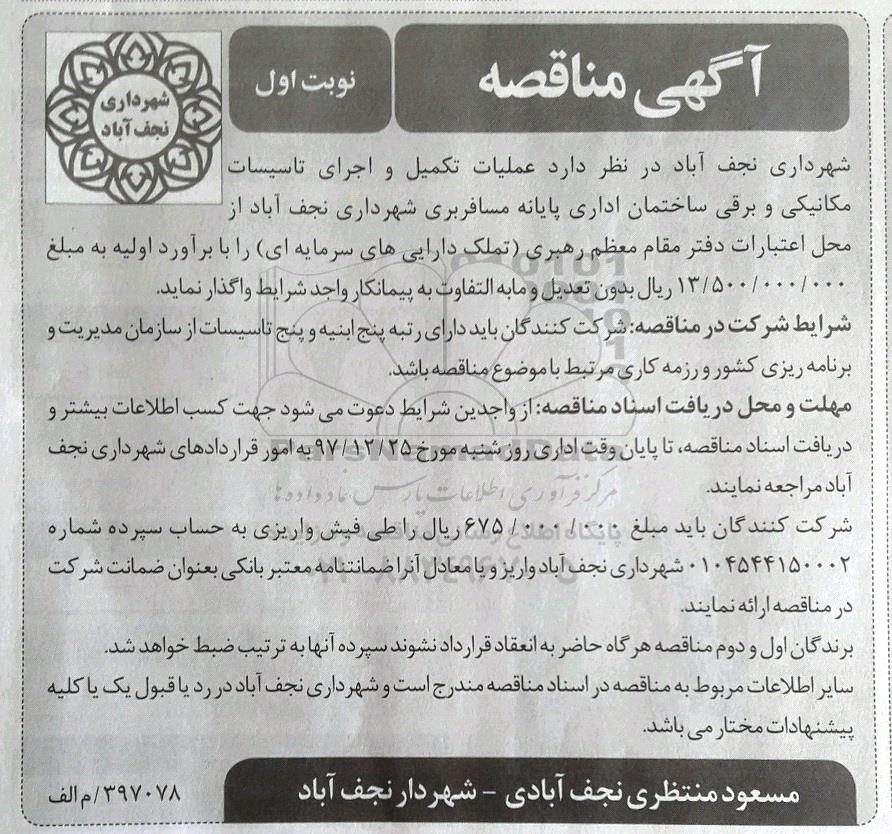شهرداری نجف آباد در نظر دارد عملیات تکمیل و اجرای تاسیسات مکانیکی و برقی ساختمان اداری پایانه مسافربری شهرداری نجف آباد از محل اعتبارات دفتر مقام معظم رهبری (تملک دارایی های سرمایه ای) را با برآورد اولیه به مبلغ 13.500.000.000 ریال بدون تعدیل و مابه التفاوت به پیمانکار واجد شرایط واگذار نماید