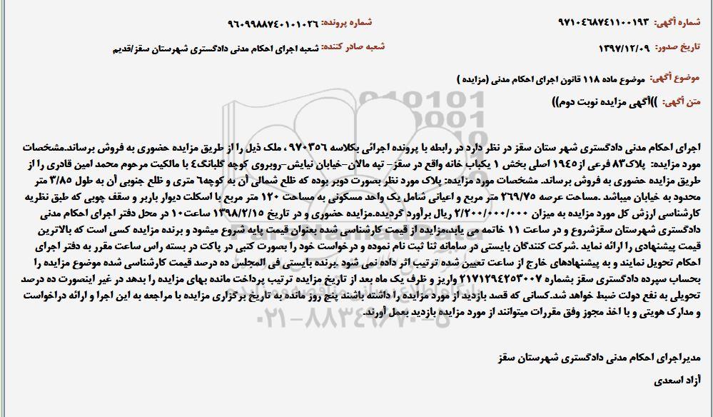 مزایده پلاک 83 فرعی از 1945 اصلی بخش 1 نوبت دوم