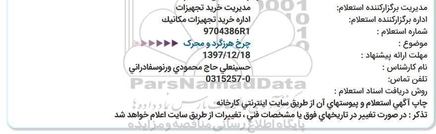 اداره برگزارکننده استعلام: اداره خرید تجهیزات مکانیک