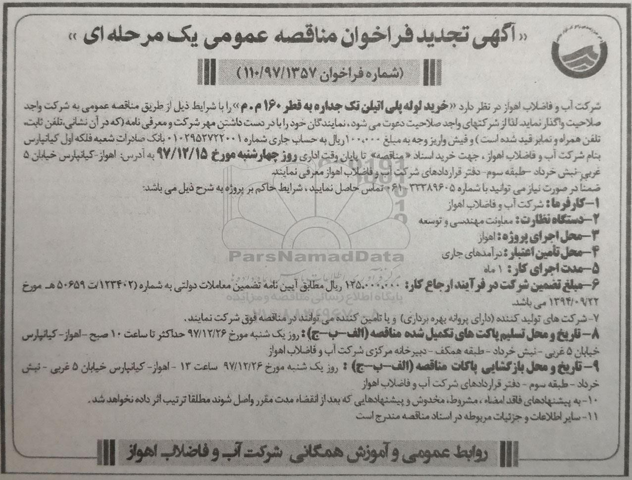 شرکت آب و فاضلاب اهواز در نظر دارد خرید لوله پلی اتیلن تکجداره به قطر160 م م با شرایط ذیل از طریق مناقصه عمومی به شرکت واجد صلاحیت واگذار نماید. لذا از شرکتهای واجد صلاحیت دعوت می شود نمایندگان خود را با در دست داشتن مهر شرکت و معرفی نامه که در آن نشانی تلفن ثابت تلفن همراه و نمابر قید شده است و فیش واریز وجه به مبلغ 100.000 ریال به حساب جاری شماره 0102952722001 بانک صادرات شعبه فلکه اول کیانپارس بنام شرکت آب و فاضلاب اهواز جهت خرید اسناد مناقصه تا پایان وقت اداری روز چهارشنبه 97.12.15 به آدرس اهواز کیانپارس خیابان پنجم غربی نبش خرداد طبقه سوم دفتر قراردادهای معرفی نمایند
