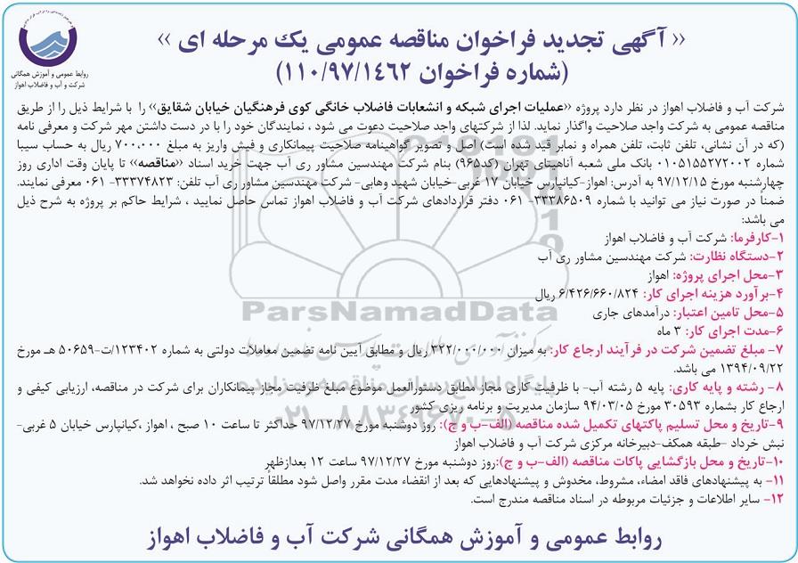 شرکت آب و فاضلاب اهواز در نظر دارد پروژه عملیات اجرای شبکه و انشعابات فاضلاب خانگی کوی فرهنگیان خیابان شقایق را با شرایط ذیل از طریق مناقصه عمومی به شرکت واجد صلاحیت واگذار نماید لذا از شرکت های واجد صلاحیت دعوت می شود نمایندگان خود را با در دست داشتن مهر شرکت و معرفی نامه که در آن نشانی تلفن ثابت، تلفن همراه و نمابر قید شده است اصل و تصویر گواهینامه صلاحیت پیمانکاری و فیش واریز به مبلغ 700000 ریال به حساب سیبا شماره 0105155272002 بانک ملی شعبه آناهیتای تهران کد 965 بنام شرکت مهندسین مشاور ری اب جت خرید اسناد مناقصه تا پایان وقت اداری روز چهارشنبه مو.رخ 97.12.15 به آدرس اهواز، کیانپارس، خیابان 17 غربی خیابان شهید وهابی، شرکت مهندسین مشاور ری آب تلفن 33374823-061 معرفی نمایند