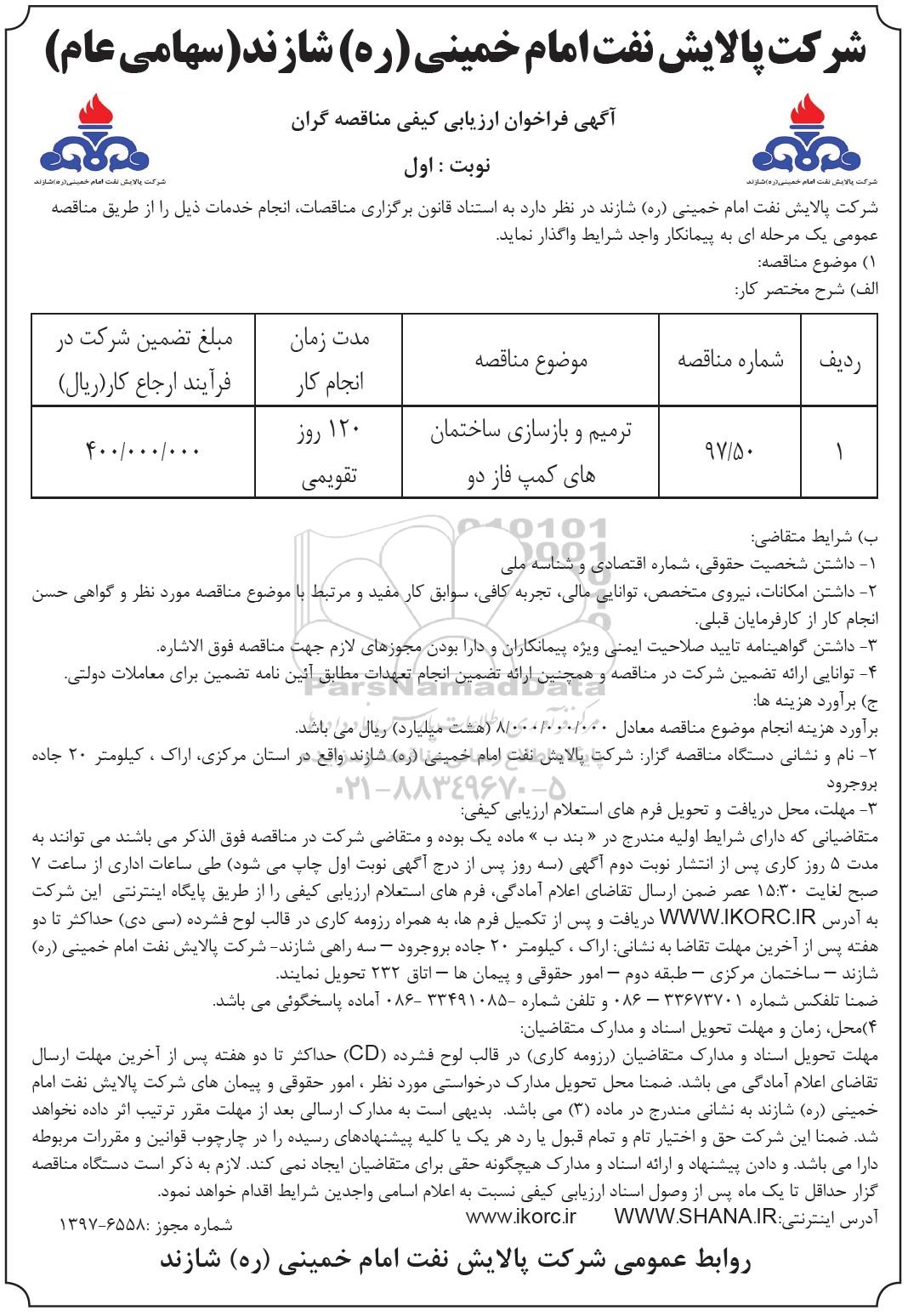 | 97/50 | ترمیم و بازسازی ساختمان های کمپ فاز دو | 120 روز تقویمی | 400.000.000 |