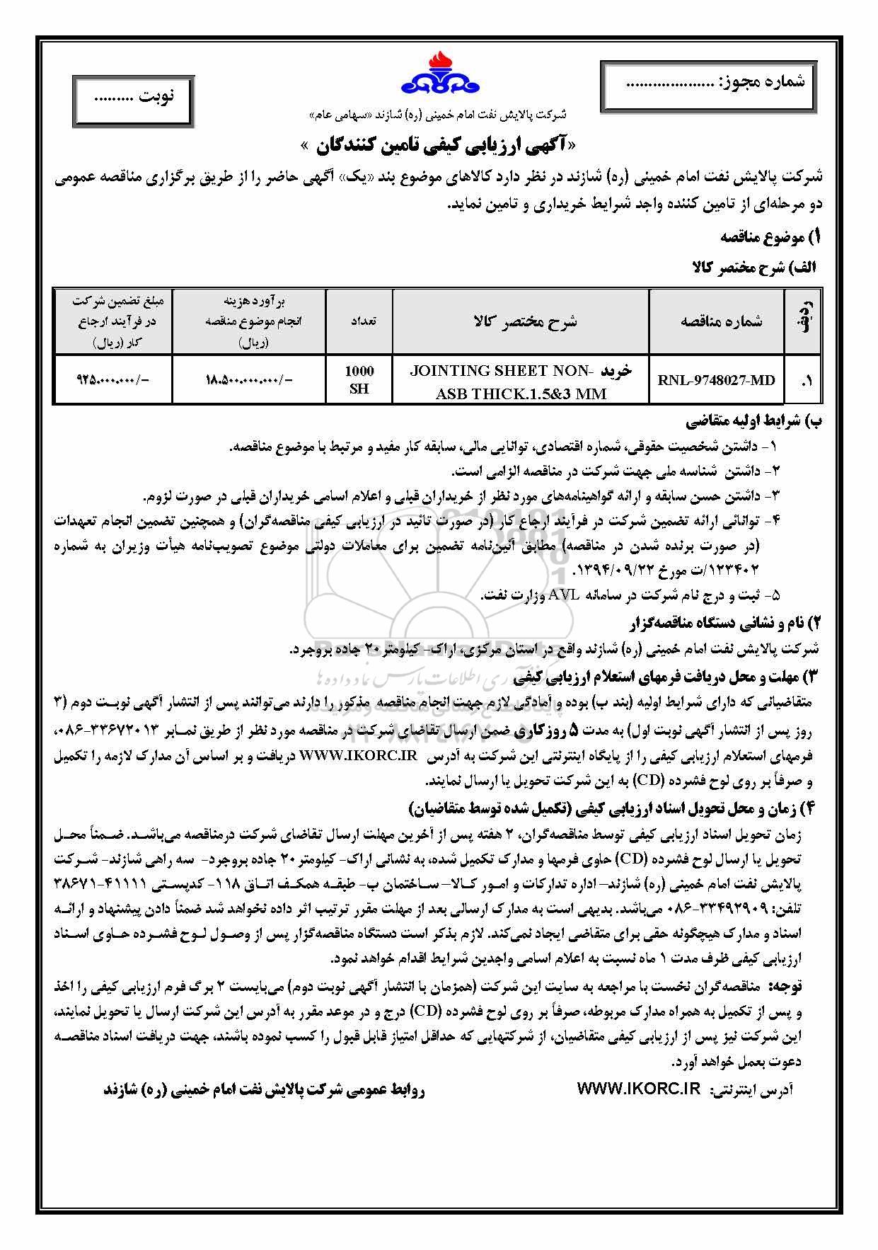 نام و نشانی دستگاه مناقصه گزا: شرکت پالایش نفت امام خمین ره شازند واقع در استان مرکزی، اراک کیلومتر 20 جاده بروجرد