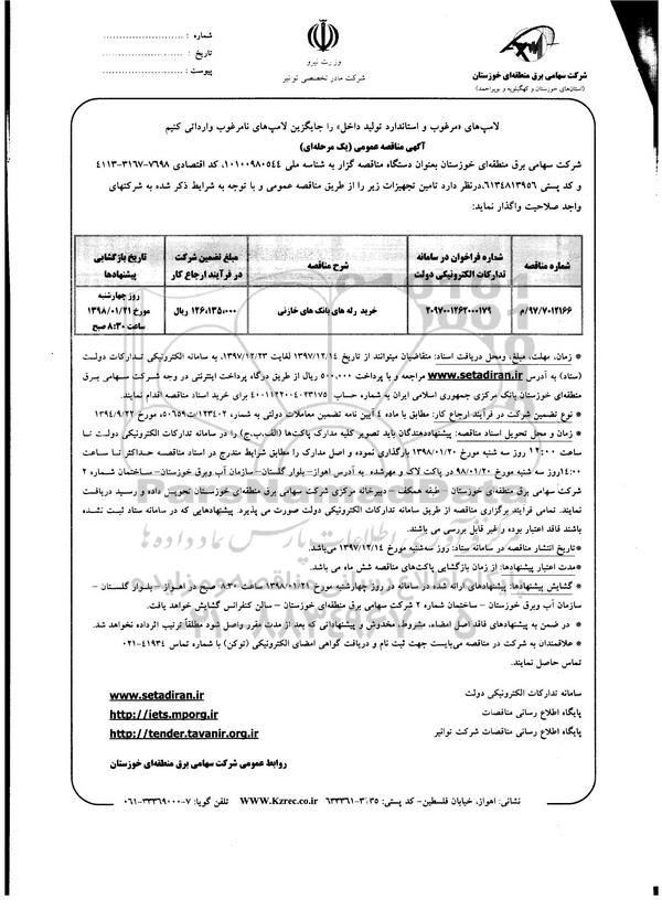 4- زمان ومحل تحویل اسناد: پیشنهاددهندگان باید تصویر کیه مدارک پاکت ها الف، ب، ج را در سامانه تدارکات اکلترونیکی دولت تت ساهت 12 روز سه شنبه مورخ 98.1.20 بارگداری نموده و اصل مدارک را مطابق شرایط مندرج در اسناد مناقصه حداقکر تا ساعت 14 روز سه شنبه مورخ 98.1.20 در پتکت لاک و مهر شده با آدرس اهواز، بلوار گلستان، سازمان آب و برق خوزستان، ساختمان شماره 2 شرکت سهامی برق منطقه ای خوزستان، طبقه همکف، دبیرخانه مرکزی شرکت سهامی برق منطقه ای خوزستان تحویل داده و رسید دریافت نمایند تمایم فرایند برگزاری مناقصهاز طریق سامانه تدارکات الکترونیکی دولت صورت می پذیرد پیشنهادهایی که در سامان ستاد ثبت نشده باشند فاقد اعتبار بوده و غیر قابل بررسی می باشد