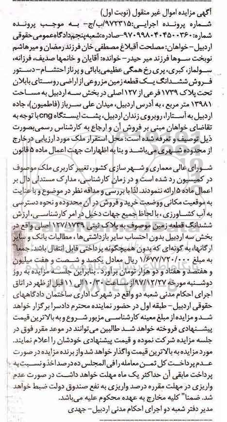 مزایده ششدانگ یک قطعه زمین مزروعی نوبت اول پرونده 972315 ب ج