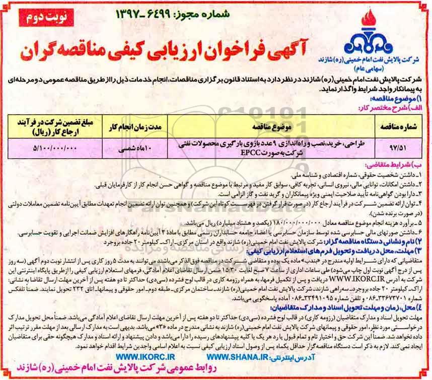 | 97/51 | طراحی، خرید، نصب و راه اندازی 9 عدد بازوی بارگیری محصولات نفتی شرکت به صورت EPCC | 10 ماه شمسی | 5.100.000.000 |