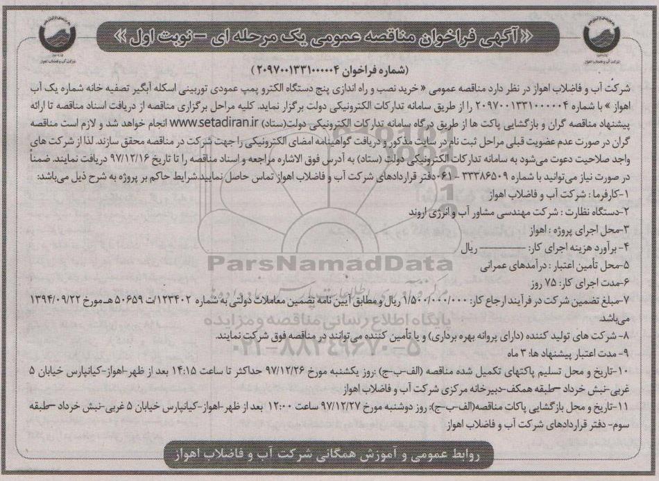 شرکت آب و فاضلاب اهواز در نظر دارد مناقصه عمومی خرید و نصب و راه اندازی پنج دستگاه الکتروپمپ عمودی توربینی اسکله آبگیر تصفیه خانه شماره یک آب اهواز با شماره 2097001331000004 را از طریق سامانه تدارکات الکترونیکی دولت برگزار نماید