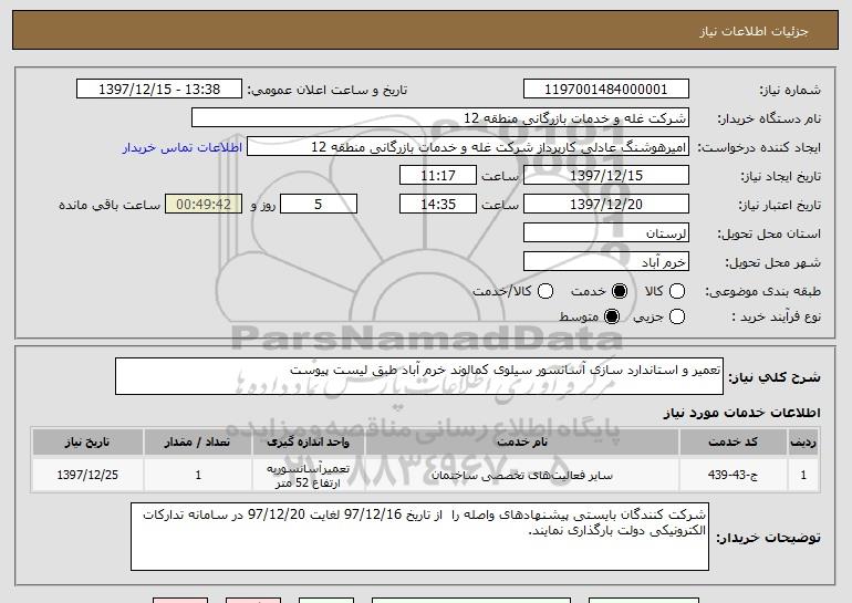 شرح کلی نیاز: تعمیر و استاندارد سازی آسانسور سیلوی کمالوند خرم آباد طبق لیست پیوست