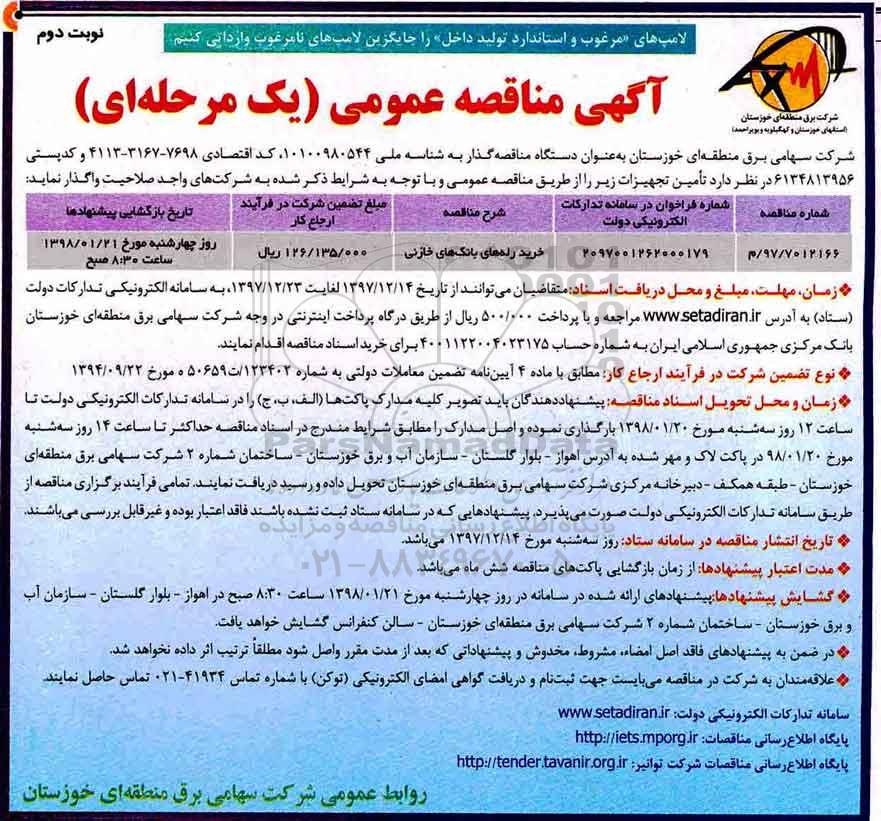 4- زمان ومحل تحویل اسناد: پیشنهاددهندگان باید تصویر کیه مدارک پاکت ها الف، ب، ج را در سامانه تدارکات اکلترونیکی دولت تت ساهت 12 روز سه شنبه مورخ 98.1.20 بارگداری نموده و اصل مدارک را مطابق شرایط مندرج در اسناد مناقصه حداقکر تا ساعت 14 روز سه شنبه مورخ 98.1.20 در پتکت لاک و مهر شده با آدرس اهواز، بلوار گلستان، سازمان آب و برق خوزستان، ساختمان شماره 2 شرکت سهامی برق منطقه ای خوزستان، طبقه همکف، دبیرخانه مرکزی شرکت سهامی برق منطقه ای خوزستان تحویل داده و رسید دریافت نمایند تمایم فرایند برگزاری مناقصهاز طریق سامانه تدارکات الکترونیکی دولت صورت می پذیرد پیشنهادهایی که در سامان ستاد ثبت نشده باشند فاقد اعتبار بوده و غیر قابل بررسی می باشد