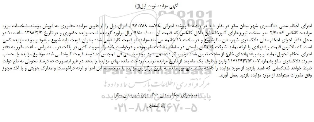 اجرای احکام مدنی دادگستری شهر ستان سقز در نظر دارد در رابطه با پرونده اجرائی بكلاسه 970789 ، اموال ذیل را از طریق مزایده حضوری به فروش برساند.مشخصات مورد مزایده: کانکس 6*2.40 متر ،ساخت تبریز،دارای آشپزخانه اپن داخل کانکس که قیمت آن 9.500.000 ریال برآورد گردیده است.مزایده حضوری و در تاریخ 1398.2.3 ساعت10 در محل دفتر اجرای احکام مدنی دادگستری شهرستان سقزشروع و در ساعت 11 خاتمه می یابد،مزایده از قیمت کارشناسی شده بعنوان قیمت پایه شروع میشود و برنده مزایده کسی است که بالاترین قیمت پیشنهادی را ارائه نماید .شرکت کنندگان بایستی در سامانه ثنا ثبت نام نموده و درخواست خود را بصورت کتبی در پاکت در بسته راس ساعت مقرر به دفتر اجرای احکام تحویل نمایند و به پیشنهادهای خارج از ساعت تعیین شده ترتیب اثر داده نمی شود .برنده بایستی فی المجلس ده درصد قیمت کارشناسی شده موضوع مزایده را بحساب سپرده دادگستری سقز بشماره 2171294253007 واریز و ظرف یک ماه بعد از تاریخ مزایده ترتیب پرداخت مانده بهای مزایده را بدهد در غیر اینصورت ده درصد تحویلی به نفع دولت ضبط خواهد شد.کسانی که قصد بازدید از مورد مزایده را داشته باشند پنج روز مانده به تاریخ برگزاری مزایده با مراجعه به این اجرا و ارائه دراخواست و مدارک هویتی و با اخذ مجوز وفق مقررات میتوانند از مورد مزایده بازدید بعمل آورند.