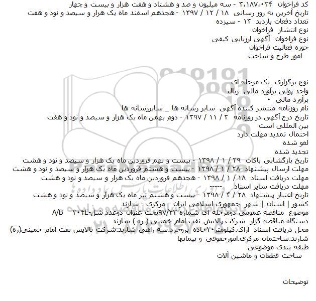 موضوع مناقصه عمومی دو مرحله ای شماره 97/43 تحت عنوان دو عدد شل E-240 A/B