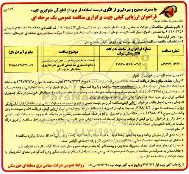 1- زمان، مهلت، مبلغ و محل دریافت اسناد مناقصه : متقاضیان می توانند از ساعت 8 مورخ 97.12.22 لغایت ساعت 18 مورخ 97.12.28 به سامانه تدارکات الکترونیکی دولت به آدرس ستاد مراجعه و با پرداخت مبلغ 200.000 ریال از طریق درگاه پرداخت اینترنتی در وجه حساب نسیم به شماره 4001122004023175 به نام تمرکز وجوه درآمد حق انشعاب و سایر درآمدهای شرکت برق منطقه ای خوزستان در بانک مرکزی جمهوری اسلامی ایران برای خرید اسناد فراخوان ارزیابی کیفی مناقصه فوق اقدام نمایند