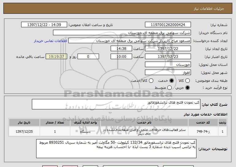 توضیحات خریدارکپ نمودن فلنج های ترانسفورماتور 132/34 کیلوولت -50 مگاولت آمپر به شماره سریال 8930251 مربوط به ترانس آسیب دیده شماره 3 پست ایذه -با احتساب هزینه بیمه