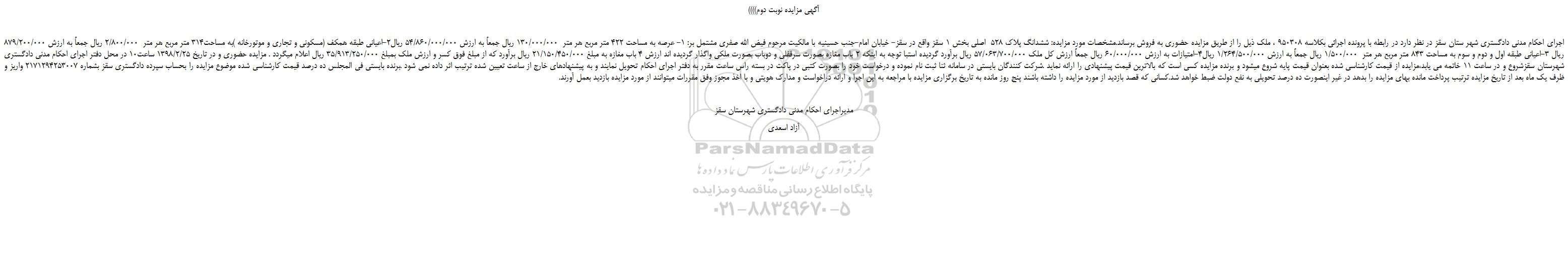 اجرای احکام مدنی دادگستری شهر ستان سقز در نظر دارد در رابطه با پرونده اجرائی بكلاسه 950308 ، ملک ذیل را از طریق مزایده حضوری به فروش برساند.مشخصات مورد مزایده: ششدانگ پلاک 528 اصلی بخش 1 سقز واقع در سقز- خیابان امام-جنب حسینیه با مالکیت مرحوم فیض الله صفری مشتمل بر: 1- عرصه به مساحت 422 متر مربع هر متر 130.000.000 ریال جمعاً به ارزش 54.860.000.000 ریال2-اعیانی طبقه همکف (مسکونی و تجاری و موتورخانه )به مساحت314 متر مربع هر متر 2.800.000 ریال جمعاً به ارزش 879.200.000 ریال 3-اعیانی طبقه اول و دوم و سوم به مساحت 843 متر مربع هر متر 1.500.000 ریال جمعاً به ارزش 1.264.500.000 ریال4-امتیازات به ارزش 60.000.000 ریال جمعاً ارزش کل ملک 57.063.700.000 ریال برآورد گردیده استبا توجه به اینکه 2 باب مغازه بصورت سرقفلی و دوباب بصورت ملکی واگذار گردیده اند ارزش 4 باب مغازه به مبلغ 21.150.450.000 ریال برآورد که از مبلغ فوق کسر و ارزش ملک بمبلغ 35.913.250.000 ریال اعلام میگردد . مزایده حضوری و در تاریخ 1398.2.25 ساعت10 در محل دفتر اجرای احکام مدنی دادگستری شهرستان سقزشروع و در ساعت 11 خاتمه می یابد،مزایده از قیمت کارشناسی شده بعنوان قیمت پایه شروع میشود و برنده مزایده کسی است که بالاترین قیمت پیشنهادی را ارائه نماید .شرکت کنندگان بایستی در سامانه ثنا ثبت نام نموده و درخواست خود را بصورت کتبی در پاکت در بسته راس ساعت مقرر به دفتر اجرای احکام تحویل نمایند و به پیشنهادهای خارج از ساعت تعیین شده ترتیب اثر داده نمی شود .برنده بایستی فی المجلس ده درصد قیمت کارشناسی شده موضوع مزایده را بحساب سپرده دادگستری سقز بشماره 2171294253007 واریز و ظرف یک ماه بعد از تاریخ مزایده ترتیب پرداخت مانده بهای مزایده را بدهد در غیر اینصورت ده درصد تحویلی به نفع دولت ضبط خواهد شد.کسانی که قصد بازدید از مورد مزایده را داشته باشند پنج روز مانده به تاریخ برگزاری مزایده با مراجعه به این اجرا و ارائه دراخواست و مدارک هویتی و با اخذ مجوز وفق مقررات میتوانند از مورد مزایده بازدید بعمل آورند.
