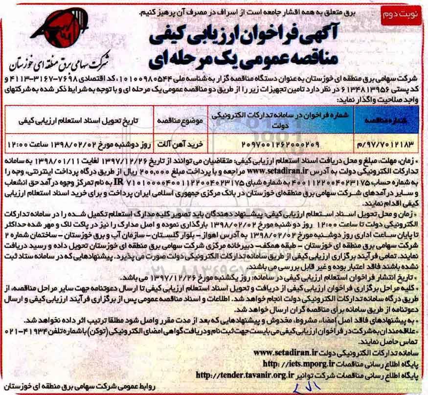 شرکت سهامی برق منطقه ای خوزستان به عنوان دستگاه مناقصه گزار به شناسه ملی 10100980544 ، کد اقتصادی 7698 - 1367 - 4113 و کدپستی 6134813956 در نظر دارد تامین تجهیزات زیر را از طریق دو مناقصه عمومی یک مرحله ای و با توجه به شرایط ذکر شده به شرکتهای واجد صلاحیت واگذار نماید :