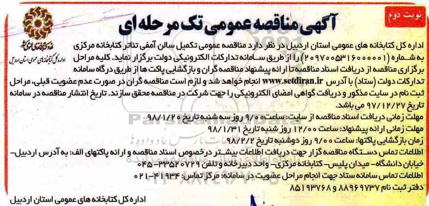 اداره کل کتابخانه های عمومی استان اردبیل در نظر دارد مناقصه عمومی تکمیل سالن آمفی تئاتر کتابخانه مرکزی به شماره 2097005316000001 را از طریق سامانه تدارکات الکترونیکی دولت برگزار نماید. کلیه مراحل برگزاری مناقصه از دریافت اسناد مناقصه تا ارائه پیشنهاد مناقصه گران و بازگشایی پاکت ها از طریق درگاه سامانه تدارکات دولت (ستاد) با آدرس ستاد انجام خواهد شد و لازم است مناقصه گران در صورت عدم عضویت قبلی، مراحل ثبت نام در سایت مذکور و دریافت گواهی امضای الکترونیکی را جهت شرکت در مناقصه محقق سازند. تاریخ انتشار مناقصه در سامانه تاریخ 97.12.27 می باشد.
