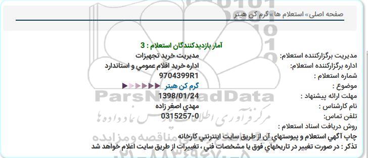 علاقهمندان میتوانند جهت دریافت اسناد و اطلاعات تکمیلی، مناقصه گرم كن هیتر با سامانه مناقصات و مزایدات ایران پارسنماد داده ها 88349670 تماس حاصل نمایند.