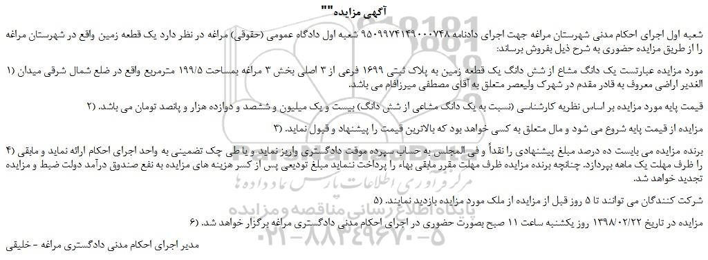 شعبه اول اجرای احکام مدنی شهرستان مراغه جهت اجرای دادنامه 9509974149000748 شعبه اول دادگاه عمومی (حقوقی) مراغه در نظر دارد یک قطعه زمین واقع در شهرستان مراغه را از طریق مزایده حضوری به شرح ذیل بفروش برساند: