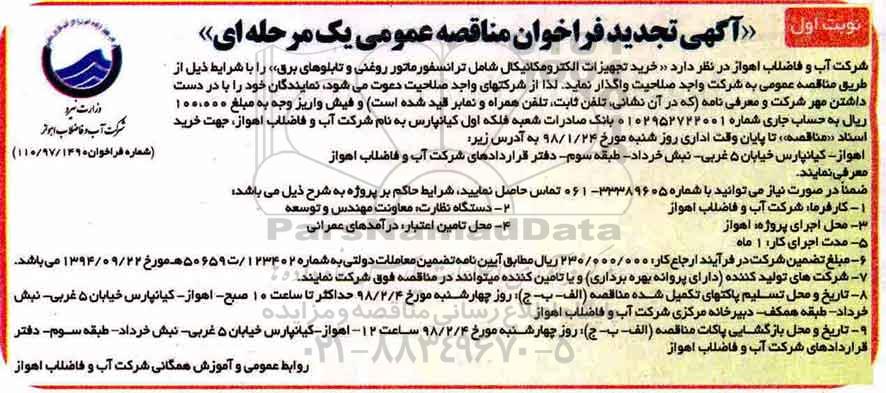 شرکت آب و فاضلاب اهواز در نظر دارد خرید تجهیزات الکترومکانیکال شامل ترانسفورماتور روغنی و تابلوهای برقی را با شرایط ذیل از طریق مناقصه عمومی به شرکت واجد صلاحیت واگذار نماید.