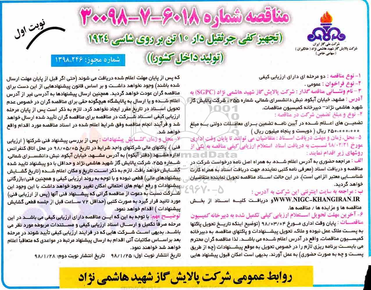 7- محل و زمان گشایش پیشنهادات: پس از بررسی پیشنهاد فنی شرکتها (ارزیابی فنی) پاکتهای مالی شرکتهای واجد شرایط در تاریخ 98.5.5 در محل اتاق کنفرانس اداره مشهد دفتر آبکوه به آدرس مشهد خیابان آبکوه نبش دانشسرای شمالی شماره 255 شرکت پالایش گاز شهید هاشمی نژاد و حداقل با دو پیشنهاد تایید شده گشایش خواهد یافت. لازم به ذکر است تا تاریخ و مکان اعلام شده تاریخ گشایش پیشنهادهای مالی قطعی نبوده و با توجه به روند ارزیابی کیفی و همچنین فنی بازرگانی پیشنهادات و رفع ابهام های احتمالی امکان تغییر وجود خواهد داشت با این وجود این شرکت نسبت به دعوت از مناقصه گرانی که پیشنهاد فنی آنها پس از ارزیابی فنی مورد تایید قرار گیرد به صورت کتبی حداقل 72 ساعت قبل از جلسه قطعی گشایش پیشنهادات اقدام خواهد نمود